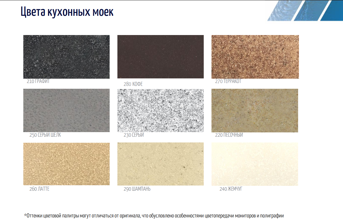 Цвет мойки: бежевый, белый, коричневый, кремовый, латте, серый, черный, шампань